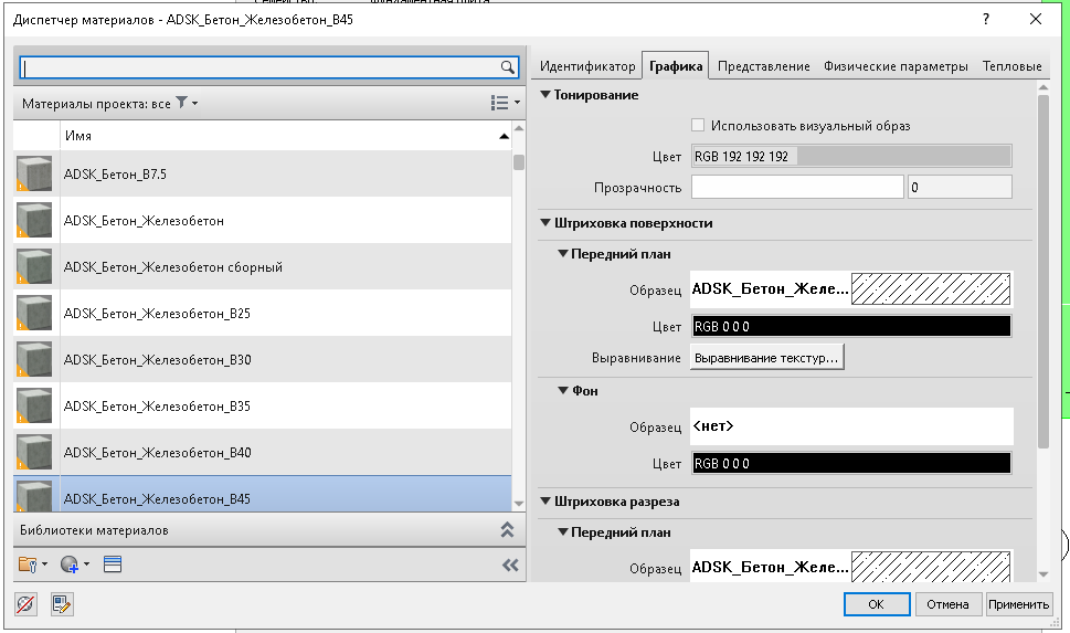 Для того, чтобы объём конструкций был рассчитан корректно необходимо применять следующие типы бетона в качестве материала (без префикса ADSK):